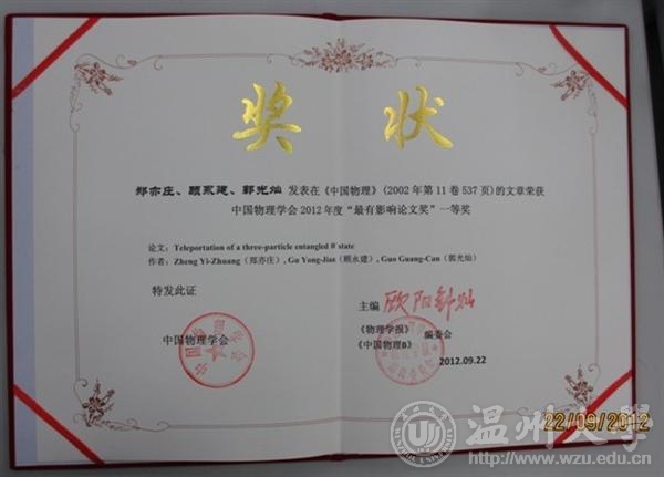 日前,在广州中山大学举行的中国物理学会秋季年会上首次颁发了中国物理学会最有影响论文奖。该奖颁发给过去10年在中国物理学会所属的《Chinese Physics Letter》,《Chinese Physics B》和《物理学报》上发表的优秀论文,共27 篇。ac米兰物电学院郑亦庄教授与中国科大郭光灿院士等合作发表在《Chinese Physics B》上的题为《Teleportation of a three-particle entangled W state》的论文荣获一等奖。