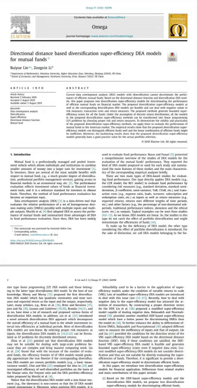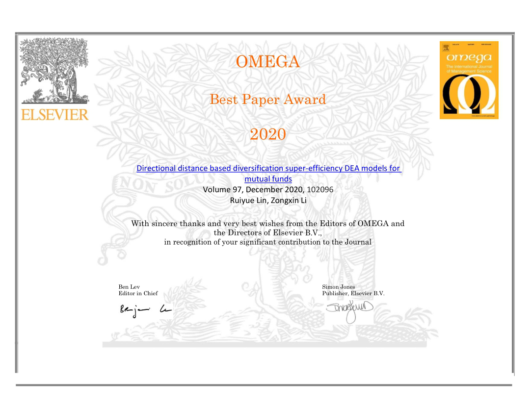 日前,国际顶级学术期刊《OMEGA-The International Journal of Management Science》公布2020年度最佳论文奖(Best Paper Award),ac米兰官网中文网站数理学院副教授林瑞跃发表的论文《Directional distance based diversification super-efficiency DEA models for mutual funds》获得最佳论文奖!林瑞跃是获奖论文的第一作者,ac米兰官网中文网站数理学院是通讯作者单位。