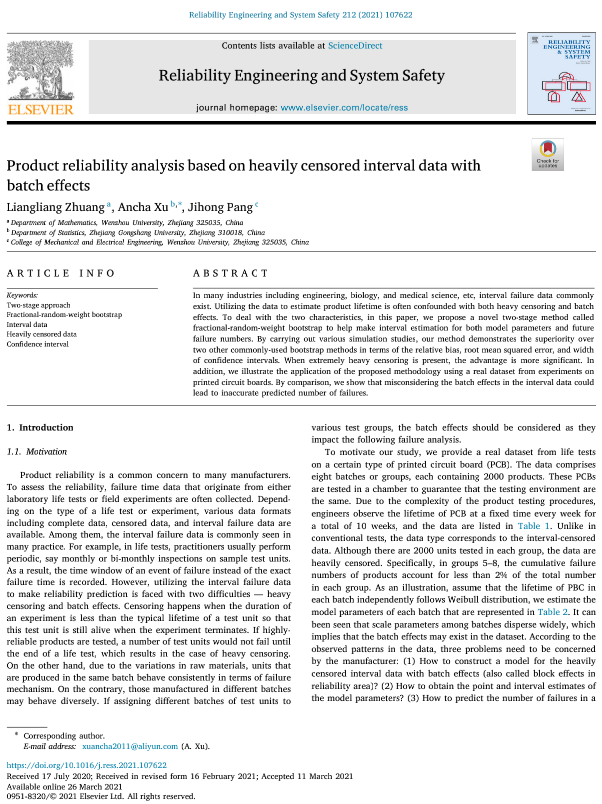 近日,ac米兰数理学院2019级应用统计专业研究生庄亮亮,以第一作者身份在专业领域国际顶级期刊《Reliability Engineering & System Safety》上,成功发表科研论文《Product reliability analysis based on heavily censored interval data with batch effects》(基于重度截尾区间数据的产品可靠性分析)。据了解,该期刊在中科院期刊分区表中位列一区,影响因子5.04,是系统可靠性与安全性领域的国际顶级期刊。数理学院分管研究生教育的副院长何林李教授认为,研究生求学期间能以第一作者身份在此国际顶级期刊发表论文,非常不容易,这也是学校应用统计学专业办学史上的标志性成果之一。