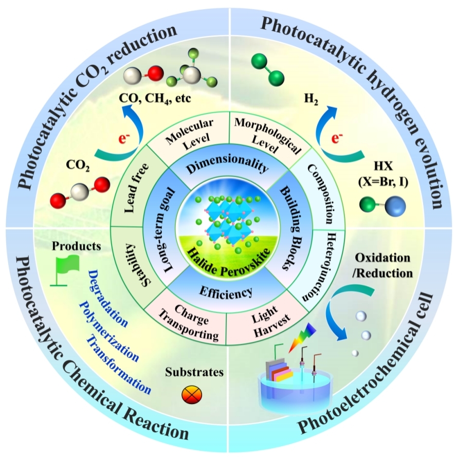 该综述文章总结了近年来金属卤化物钙钛矿材料的维度、合成以及异质结结构等发展,系统深入剖析了钙钛矿材料在光催化化学转化、二氧化碳还原、产氢和光电催化领域应用中的作用机制,并对新型钙钛矿材料的结构/维度设计合成、催化性能、稳定性提升方法等科学问题研究提出了展望。该综述将为从事金属卤化物钙钛矿光(光电)催化研究的科研人员提供有价值参考,加速新一代高性能钙钛矿功能材料开发和应用的进展步伐。