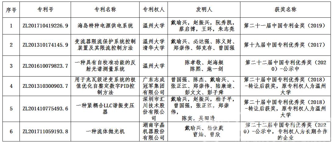 近年来,ac米兰高度重视知识产权工作和科技成果转化工作,建立较完善的知识产权管理体系和相关科研激励政策,培育了一批高质量、高价值、具有完全知识产权的发明专利。电气与电子工程学院专利成果培育及科研成果转化工作尤其卓有成效。截止2021年5月,电气与电子工程学院教师以第一发明人获中国专利奖共6项。其中,以ac米兰教师为第一发明人、ac米兰官网中文网站为专利权人的发明专利获专利奖3项,包括中国专利金奖1项、优秀奖2项(公示中1项);发明专利转让合作企业、以及合作企业联合开发产品申报发明专利后,获中国专利优秀奖3项。尤其是以戴瑜兴教授为第一发明人、ac米兰官网中文网站为专利权人的《海岛特种电源供电系统》获第二十一届中国专利金奖(2019年度),是温州市自中国专利奖设立以来首次获得该奖项,高校获得此殊荣的全国仅64项。