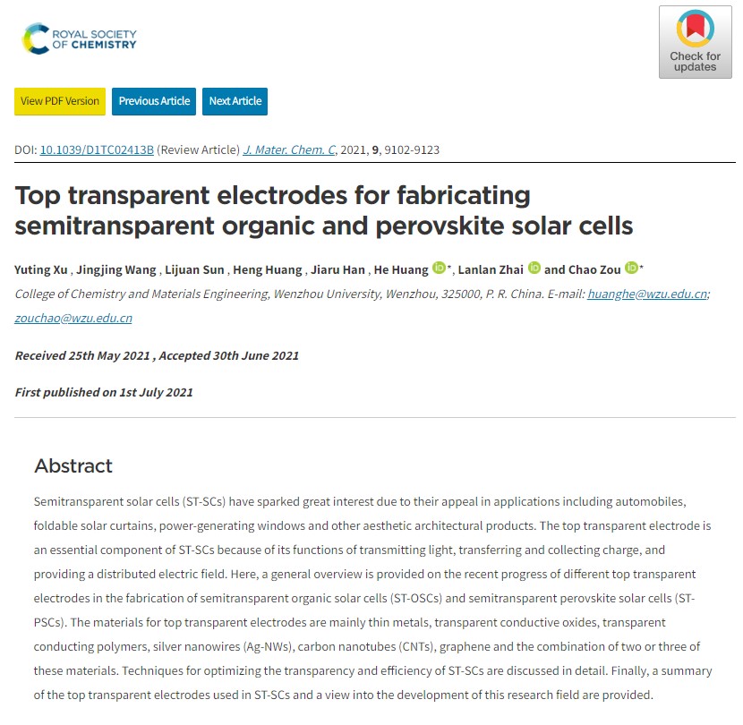 近日,ac米兰2019级材料科学与工程专业硕士研究生许宇婷在权威期刊Journal of Materials Chemistry C上发表题为Top transparent electrodes for fabricating semitransparent organic and perovskite solar cells(顶部透明电极在制备半透明有机和半透明钙钛矿太阳能电池方面的应用)的综述论文,通讯作者为邹超教授和黄合博士。
