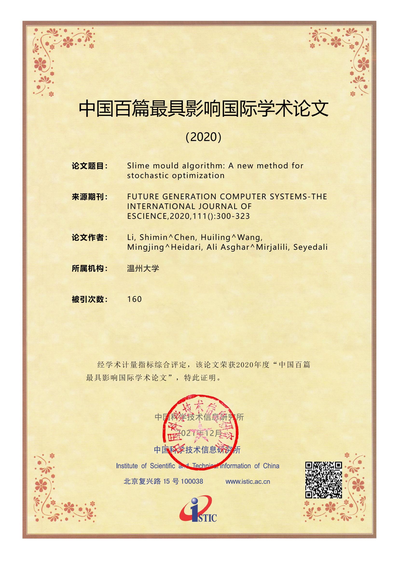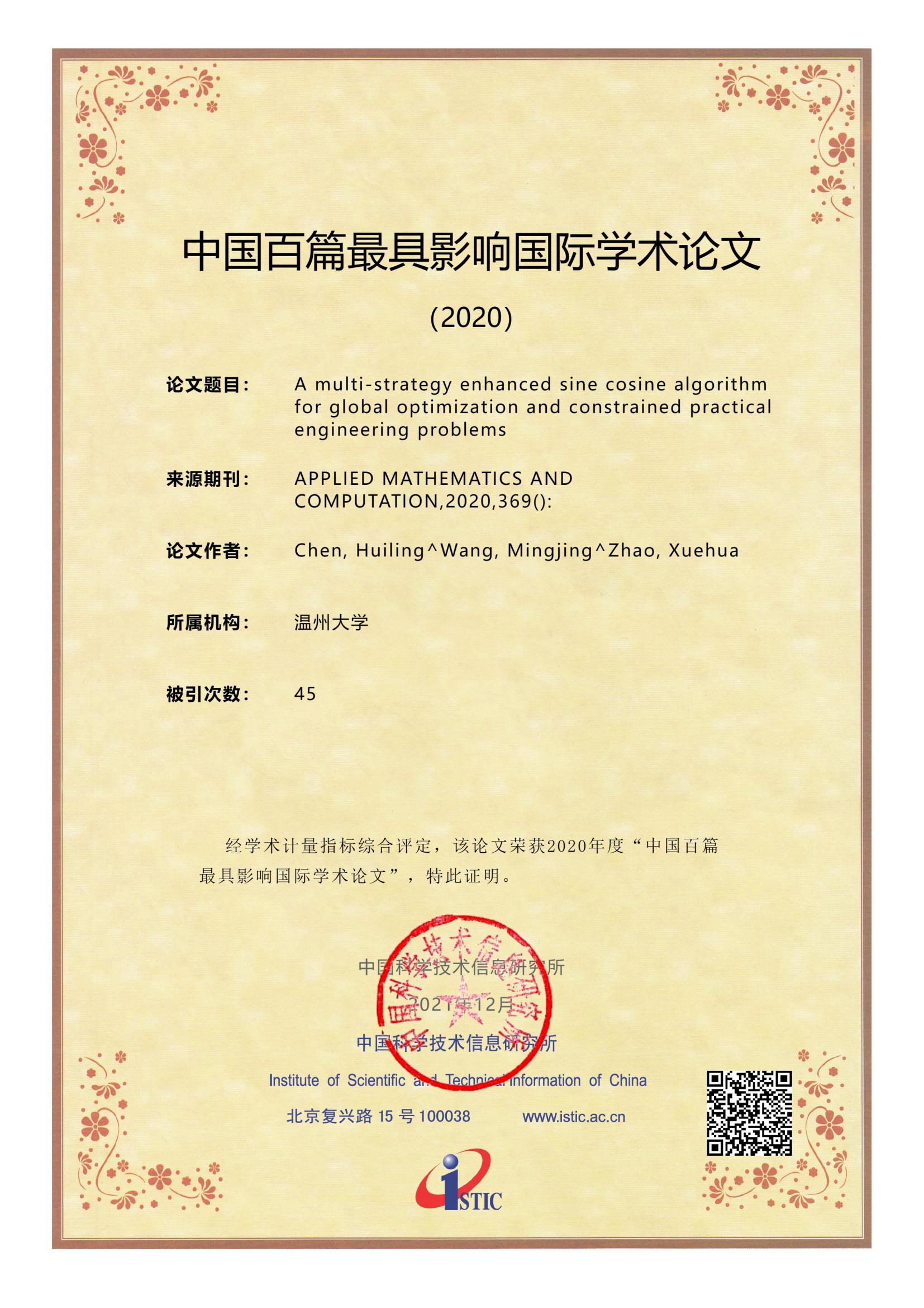2021年12月27日,科技部直属的国家级公益类科技信息研究机构-中国科学技术信息研究所发布《2021年中国科技论文统计报告》,并评选出2020年“中国百篇最具影响国际学术论文”。ac米兰官网中文网站陈慧灵瓯江特聘教授团队2篇论文《A multi-strategy enhanced sine cosine algorithm for global optimization and constrained practical engineering problems》、《Slime mould algorithm: A new method for stochastic optimization》同时入选。