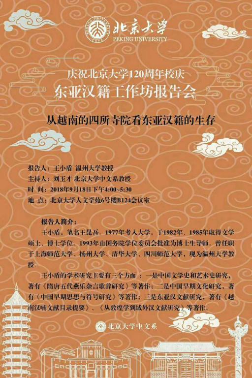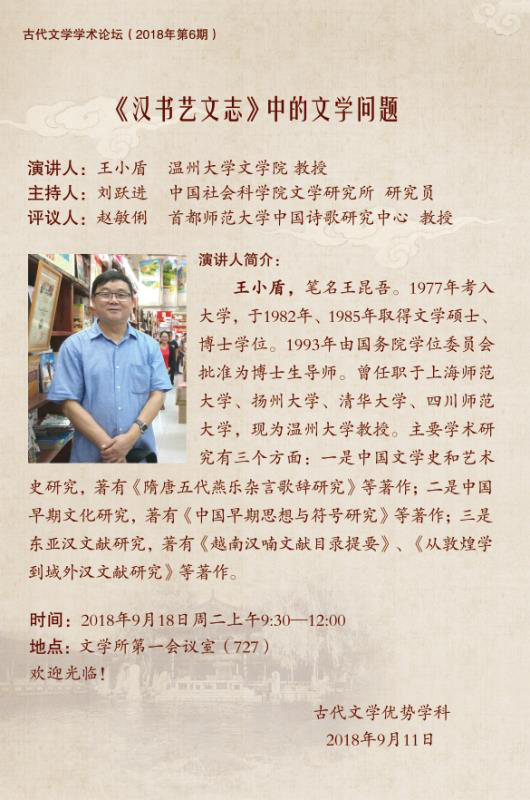 9月18日上午,ac米兰官网中文网站特聘教授王小盾在中国社会科学院文学所第一会议室主讲古代文学学术论坛第6期 《<汉书艺文志>中的文学问题》。下午,王小盾教授在北京大学人文学苑6号楼B124会议室作题为《从越南的四所寺院看东亚汉籍的生存》的主题报告。晚上,中国红楼梦学会常务理事饶道庆教授在北京的恭王府开讲《“正邪两赋”话宝玉》,这是北京青年报"青睐"线下活动携手恭王府举办"走进红楼梦中人——恭王府与《红楼梦》“主题系列讲座的第四场。