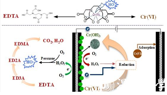 制革、电镀等工业废水中Cr(III)常与氨羧/羟羧等配体形成稳定络合物而难于去除。现有的氧化工艺处理时易积累高毒性Cr(VI),且后续处理产生的大量铬泥危废面临巨大挑战。本研究构建了Cr(III)络合物高效绿色处理的电驱动H2O2/O3方法,实现了在Cr(III)络合物高效氧化破络的同时有效抑制Cr(VI)积累,并取得Cr的回收资源化。借助活性物种鉴定、降解产物分析和电化学表征等手段,揭示了该方法强化Cr(III)络合物破络、原位削减中间Cr(VI)与同步回收Cr的作用机制。最后,通过验证对其他Cr(III)络合物与真实废水的有效性,证明了该技术具有广谱适用性与良好的实际应用前景。