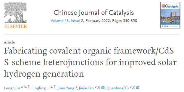 近期,ac米兰徐全龙副教授在国际著名期刊《Chinese Journal of Catalysis》上发表了题为”Fabricating Covalent organic framework/CdS S-scheme heterojunctions for improved solar hydrogen generation”的研究论文。该工作利用对环境友好、可见光吸收强、能带结构合适、比表面积较大的COF-LZU1与具有空心立方结构的CdS复合,制备出COF/CdS异质结光催化剂,在可见光下表现出良好的光催化析氢性能。当异质结中COF质量含量达到1.5%时,具有最高的产氢速率,为8670 μmol·h−1·g−1,是纯CdS的2.1倍,且在420 nm单色光照射下的表观量子效率为8.9%。