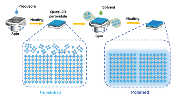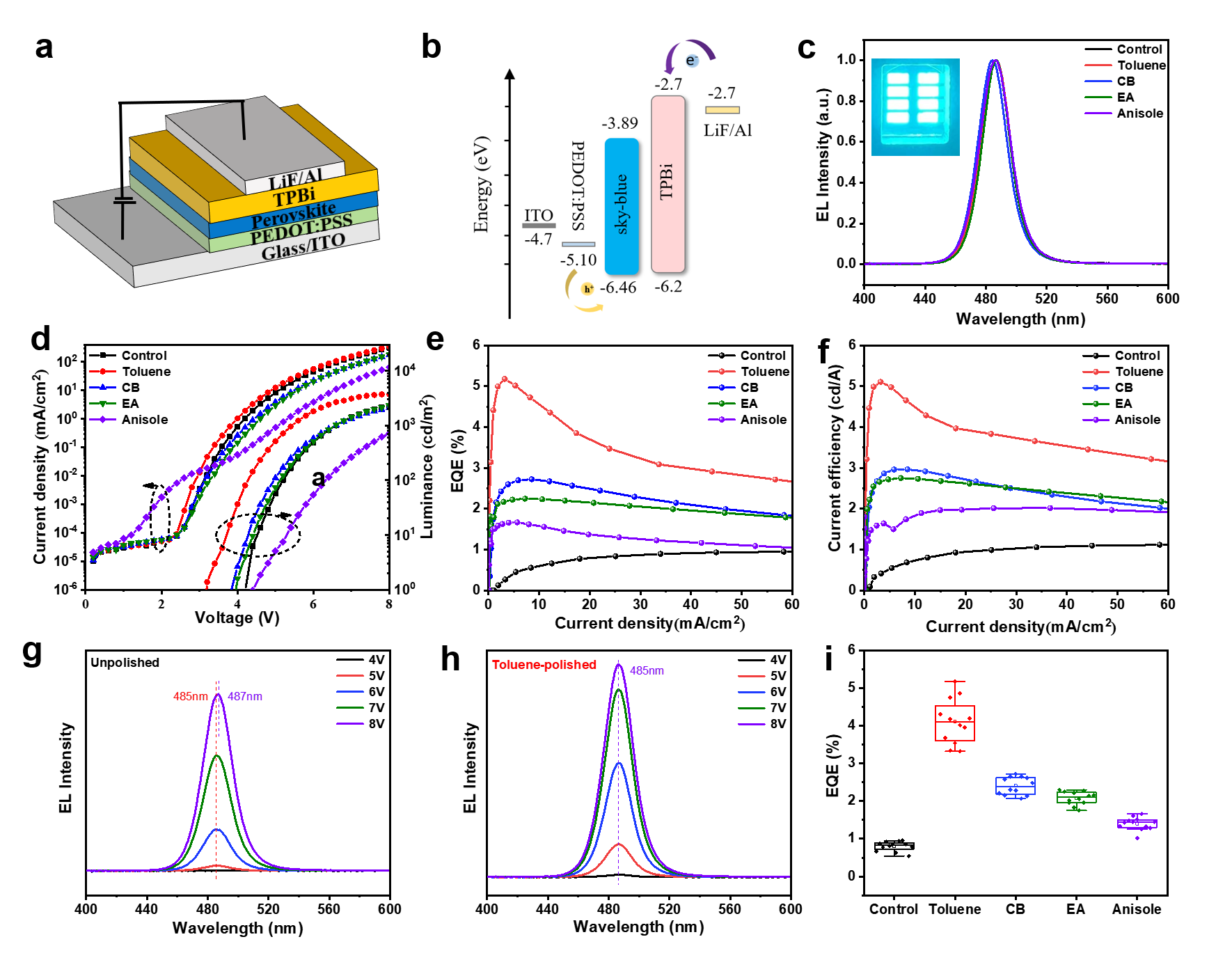 近日,ac米兰官网中文网站邹超课题组提出了一种溶剂抛光策略,在不影响载流子输运的前提下有效去除钙钛矿表面的富缺陷层,并有效减少非辐射复合中心n=1相的形成。通过系统研究抛光效果与溶剂极性的关联,确定甲苯溶剂能够在最大限度维持钙钛矿薄膜性质的基础上有效消除缺陷。研究中实现了高效的蓝光PeLED器件,在485 nm处的最大EQE为5.18 %,最高亮度为3737 cd m-2,启亮电压为3.2 V,分别比未抛光的PeLED器件(启亮电压:4.2 V)高出545 %和162 %。这项研究在不损失载流子输运效率的前提下为缺陷消除提供了一种新思路,以实现高效的蓝光PeLED。