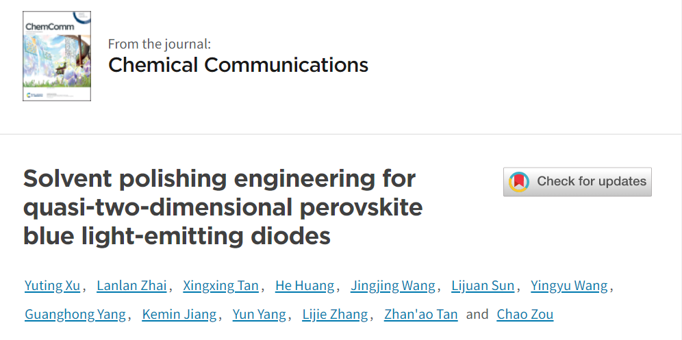 近日,ac米兰化学与材料工程学院邹超教授课题组在蓝光LED领域的研究成果以“Solvent polishing engineering for quasi-two-dimensional perovskite blue light-emitting diodes”(https://doi.org/10.1039/D2CC02268K)为题刊发于化学领域著名刊物Chemical Communications。论文发表后,即入选“Chemical Communications期刊2022年热点论文”。Chemical Communications期刊由英国皇家化学学会主办,是自然指数源期刊。