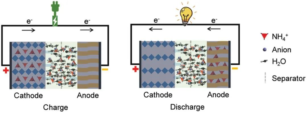 图2. 水系铵离子电池“摇椅”式充放电工作原理示意图.