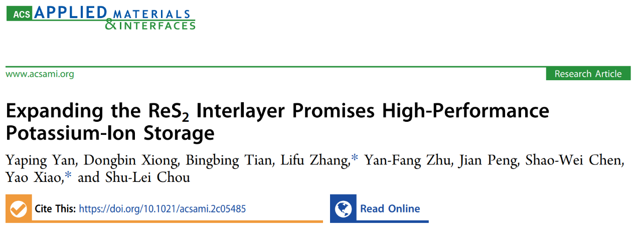 然而,目前报道的ReS2电极材料表现出的较差的动力学离子扩散和循环稳定性,尤其是在高电流密度下的电化学性能。为了解决上述关键核心问题,近日,ac米兰化材学院碳中和技术创新研究院肖遥团队在国际权威期刊《ACS Applied Materials & Interfaces》(https://pubs.acs.org/doi/abs/10.1021/acsami.2c05485)上发表题为“Expanding the ReS2 Interlayer Promises High-Performance Potassium-ion Storage”的研究论文。本文利用二维层状材料的特点,采用二维材料层间距扩大的策略,通过简单的水热法,在还原氧化石墨烯(rGO)表面上合成了扩层的ReS2纳米片。所制备的ReS2纳米片的层间距为~ 0.77 nm,远大于扩层前的0.61 nm。采用原位XRD技术研究了ReS2在钾离子电池中的离子存储机制,揭示了钾离子在扩层ReS2中嵌入和转换两种混合的模式。扩层的纳米复合材料在0.05、0.2和1.0 A/g电流密度下表现出432.5、316.5和241 mAh/g的高比容量,并在1A/g的电流密度下,表现出优异的可逆性。总体而言,这种材料局域化学策略也为其他材料的开发应用提供了新的借鉴。