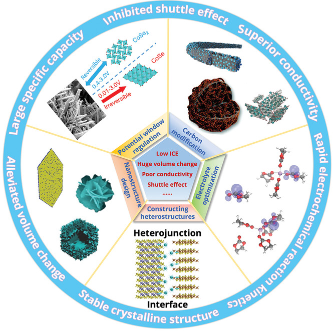 图1.钠离子电池中金属硒化物负极存在的问题及相应的优化策略