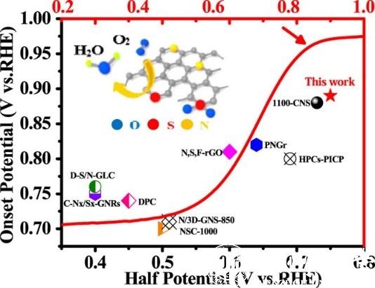 该研究所制备的NSPCS材料由多孔碳片组成,其表面具有高密度的活性位点和丰富的结构缺陷。S、N掺杂的协同效应使该材料具有优异的电化学性能,其在酸性体系中表现出高的起始还原电位,优于目前已报道的所有杂原子掺杂碳基电极材料。同样重要的是,NSPCS材料在碱性介质中具有比商业化Pt/C催化剂更高的半波电位。同时NSPCS用作水系超级电容器电极材料时,呈现出超快的充放电性能和优异的循环稳定性。本研究发展的新颖共掺杂策略为开发高性能、低成本多功能电极材料提供了新路径。