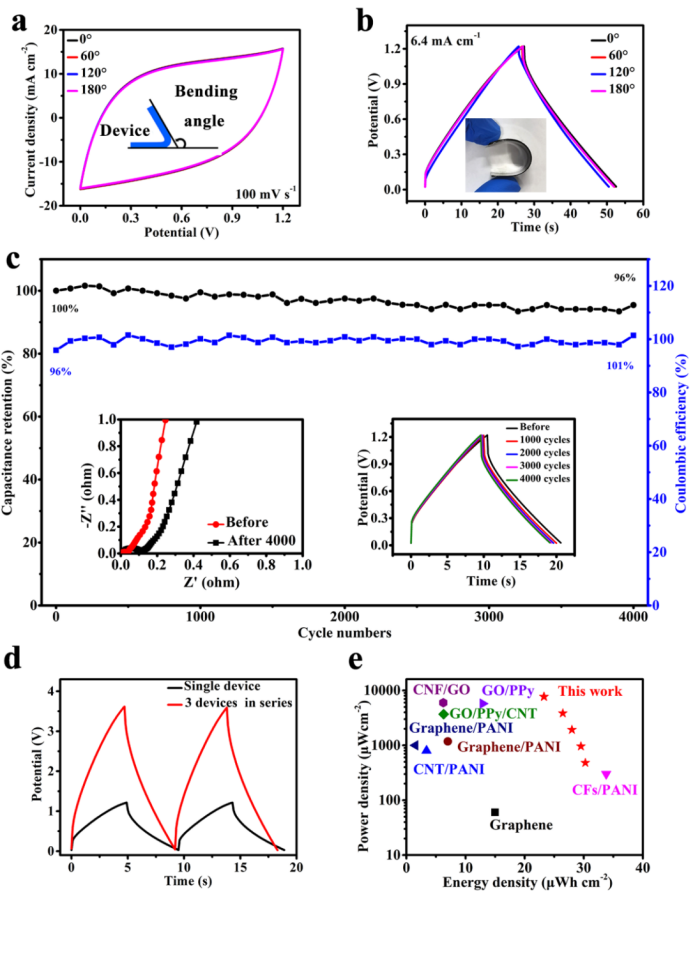 如图3所示,该工作还尝试制备了柔性全固态超级电容器以及袋式超级电容器,由于不需要加入大量的商业导电炭黑,两种器件的性能评价均表现出较高的面功率和面能量密度。