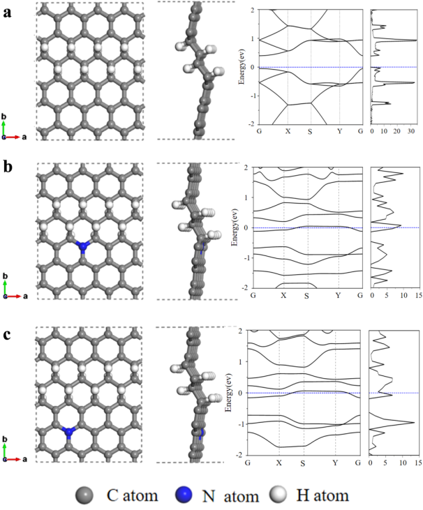图2: sp2/sp3杂化碳的原子结构、电子能带结构和态密度