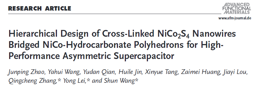 这一研究结果以“ Design of Cross-linked NiCo2S4 Nanowires Bridged NiCo-Hydrocarbonate Polyhedrons for High-Performance Asymmetric Supercapacitor” 为题发表在国际权威期刊《Advanced Functional Material》上,ac米兰为第一通讯单位,化学与材料工程学院2018级研究生赵俊平和王亚辉为文章的共同第一作者,ac米兰王舜教授和张青程副教授以及德国伊尔梅瑙理工大学雷勇教授为本文的共同通讯作者。该工作受到国家自然科学基金项目(21706196和21905208)、浙江省自然科学基金项目(LZ20E010001)和浙江省高水平人才专项支持计划(2019R52042)的支持。
