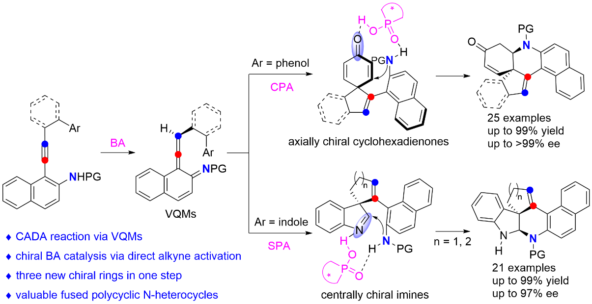 近些年来,通过活化惰性炔烃来实现炔烃催化不对称官能团化反应一直受到人们的广泛关注。与成熟的过渡金属催化这些转化相比,基于惰性炔烃活化的不对称有机催化发展相对较少。近日,ac米兰钱鹏程教授课题组与厦门大学叶龙武教授课题组合作以简单易得的苯酚高炔丙胺和吲哚高炔丙胺为底物,实现了Brønsted酸直接活化炔烃并成功完成苯酚和吲哚催化不对称去芳构化反应。该反应具有如下特点:(1)实现了Brønsted酸直接活化炔烃;(2)报道了无金属参与的基于苯酚和吲哚的不对称去芳构化反应;(3)一步构建具有季碳且多立体中心的含氮杂环;(4)具有优秀的化学选择性、对映选择性和立体选择性。