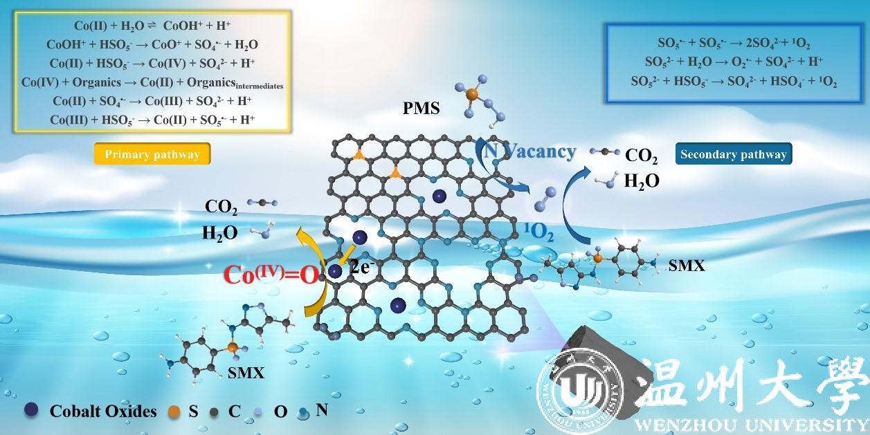 近日,生环学院分散式污水与流域生态治理团队在国际著名期刊Chemical Engineering Journal发表题为“Multivalent Cobalt Species Supported on Graphene Aerogel for Degradation of Sulfamethoxazole via High-Valent Cobalt-Oxo Species”的论文,提出了一种新型多价钴负载石墨烯气凝胶催化材料制备方法。该催化材料在PMS高级氧化体系中对多种抗生素和内分泌干扰物可以实现高效去除。材料制备中以水溶性磺化酞菁钴(CoPcS)为金属前驱体,经过充分搅拌均匀分散在氧化石墨烯水凝胶中,加入绿色食品级交联剂海藻酸钠进行交联,采用冷冻干燥法在材料内部形成丰富的三维孔隙网络结构。再经过氮气氛围高温煅烧后得到结构稳定、性能优异的多价钴负载石墨烯气凝胶材料rGO-CoPcS-SA。通过结构表征发现rGO-8CoPcS-SA催化材料具有微观多孔网络结构(图1a),过渡金属钴是以Co(II)和Co(Ⅲ)的形式存在于石墨烯结构中(图1b),多价态的钴加速了不同钴物种之间的转化,提高了电子传输速率,实现了多种抗生素和内分泌干扰物【包括:土霉素(OTC)、磺胺甲恶唑(SMX)、环丙沙星(CIP)、磺胺嘧啶(SDZ)、布洛芬(IBU)、双酚A(BPA)、左氧氟沙星(LEV)】废水的高效降解(图1c),并且在多种阴离子NO3−、SO42−、HCO3−、Cl−、H2PO4−和腐殖酸HA共存时,仍然保持优异的催化降解性能(图1d)。并且经过10次重复循环利用后,SMX的降解率仍保持100%(图1e)。通过电化学表征、EPR分析技术等阐明了催化材料与有机污染物降解之间的构效关系,研究发现Co–Nx、非金属N元素、O–C=O和II C–SOx–C是反应过程中的活性组分可以激活PMS形成活性氧物种(ROS)攻击有机污染物分子,其中高价Co(IV)=O物种是降解有机物最重要的ROS(如图2)。此外,本研究还自主设计了流化床反应器,自组装了一套连续流运行装置(图1f),对催化剂的实际应用进行了小试实验,在180 min内实现了2700 mL SMX废水(10 mg/L)的高效降解,充分证明了rGO-8CoPcS-SA材料在PMS体系中优异的催化活性、稳定性、重复利用性和应用于实际污水处理场景中的潜力。