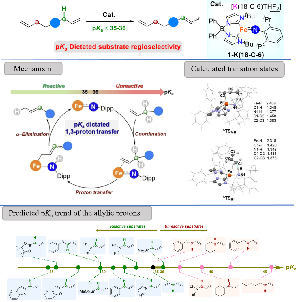 ac米兰化材学院汤浩教授理论计算课题组与美国印第安纳大学化学系Jeremy M. Smith教授课题组合作报道了高自旋三配位Fe(II)亚胺配合物(1-K-(18-C-6))催化的双键转位反应,通过1,3-氢质子迁移实现了1-烯烃向2-烯烃的转化。其中,双键转位是由Fe(II)中心和碱性亚胺配体的协同作用实现。DFT计算的过渡态结构揭示了烯丙基氢直接从1-烯烃转移到亚胺配体上(5TSA-B) ,随后烯丙基C1与氨基配体上的氢结合 (5TSB-1)获得相应的产物,而Fe–H物种并未参与。底物烯丙基质子的pKa决定反应的区域选择性,而且双键转位发生的转折点在于烯丙基质子的pKa ≈ 35−36处。值得一提的是:铁催化剂的高自旋(S = 2)允许反应具有良好的官能团耐受性,包括典型毒化催化剂的位点,如胺、含N-杂环、膦化物等。