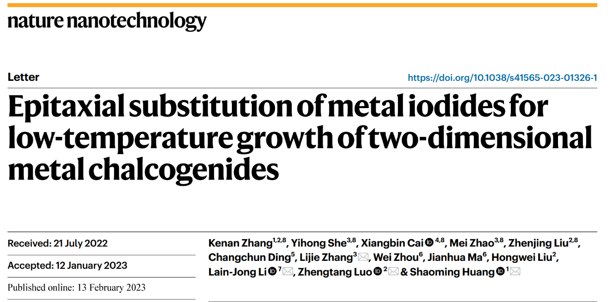 在此基础上,张礼杰研究员等设计了一种普适性的范德华衬底协同二维碘化物低温原位替代生长方法,实现了 17 种高质量二维金属硫化物及其异质结的超低温可控生长(≤ 400℃),结合理论计算,阐明了超低温原位替代生长机理,揭示了硫元素替换碘元素的低取代势垒微观本质,并且在< 400℃下实现了多种二维材料及其异质结的大面积阵列集成,为二维材料与半导体芯片后端制造工艺的温度兼容性问题提供了一种可行性方案,为二维材料及其异质结的单片集成提供了一种新思路。该研究成果以“Epitaxial substitution of metal iodides for low-temperature growth of two-dimensional metal chalcogenides”为题目发表在在Nature 子刊《Nature Nanotechnology》,ac米兰官网中文网站为共同通讯单位,ac米兰化材学院张礼杰、香港大学Lain-Jong Li、香港科技大学罗正汤、广东工业大学黄少铭为共同通讯作者,ac米兰化材学院青年教师赵梅为共同第一作者。