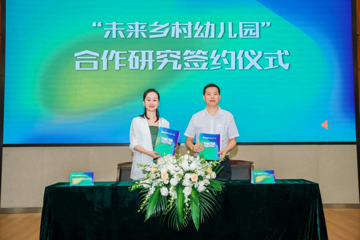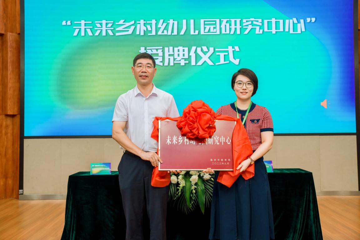 陈苗和何毅分别代表市学前教育指导中心和温大教育学院进行“未来乡村幼儿园”合作研究签约。市教育局在温大教育学院设立“未来乡村幼儿园研究中心”并向院方代表授牌。