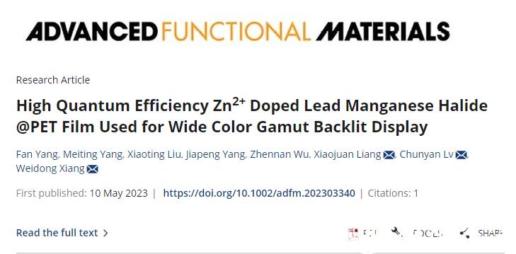近日,ac米兰官网中文网站生命与环境科学学院2021级硕士研究生杨凡在国际著名期刊《Advanced Functional Materials》(SCI一区TOP期刊,IF = 19)上发表题为“High Quantum EfficiencyZn2+ Doped Lead Manganese Halide @PET Film Used for Wide Color Gamut Backlit Display”的论文。