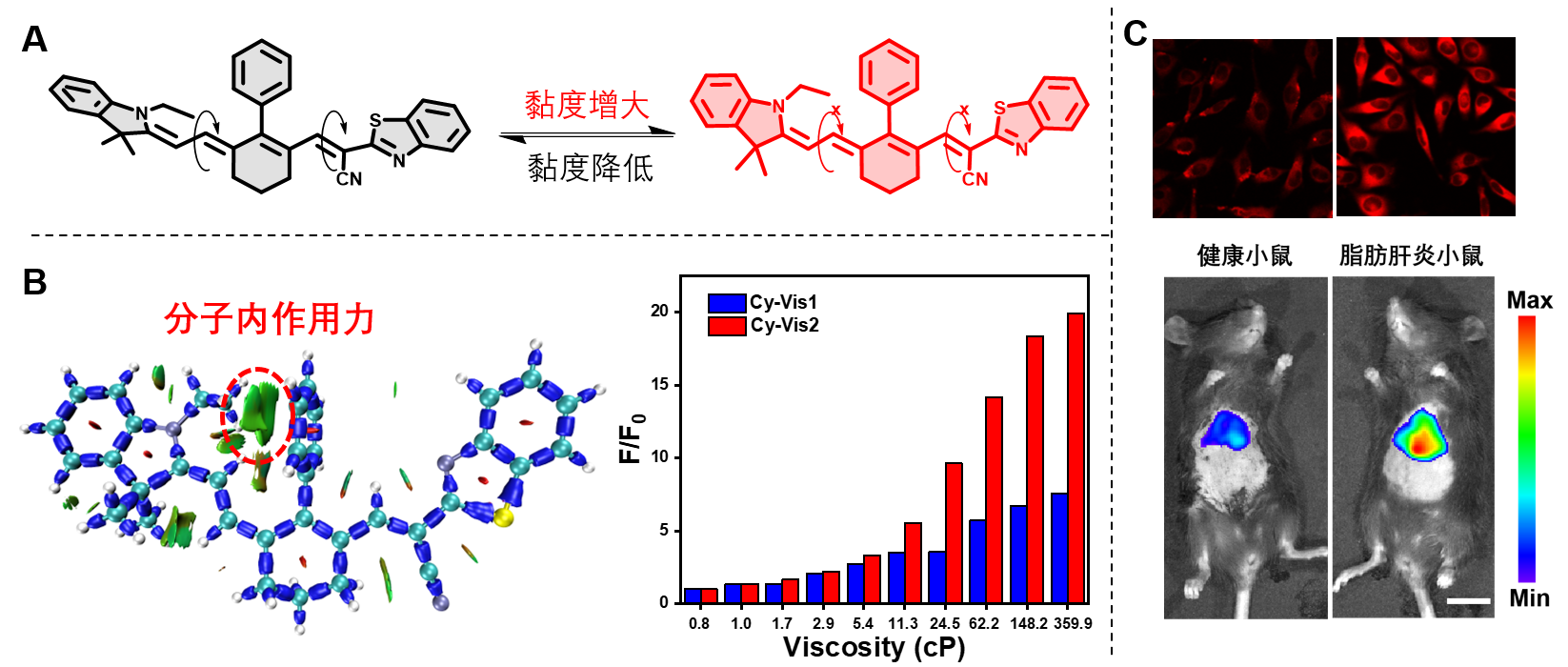 陈忠研/葛景园团队在前期研究(Anal. Chem. 2022, 94, 12383−12390)基础上通过改变分子表面静电式、引入旋转转子和调控探针分子内相互作用力等方式成功构筑两例黏度响应的荧光探针Cy-Vis1和Cy-Vis2。理论计算结果表明苯环的引入增大了分子内相互作用力,大幅提升了Cy-Vis2对环境黏度的敏感度。尾静脉注射Cy-Vis2后,探针在肝脏部位富集,并实现了NASH小鼠与健康小鼠在成像上的区分,为荧光成像技术在NASH检测的应用提供理论和实验依据。