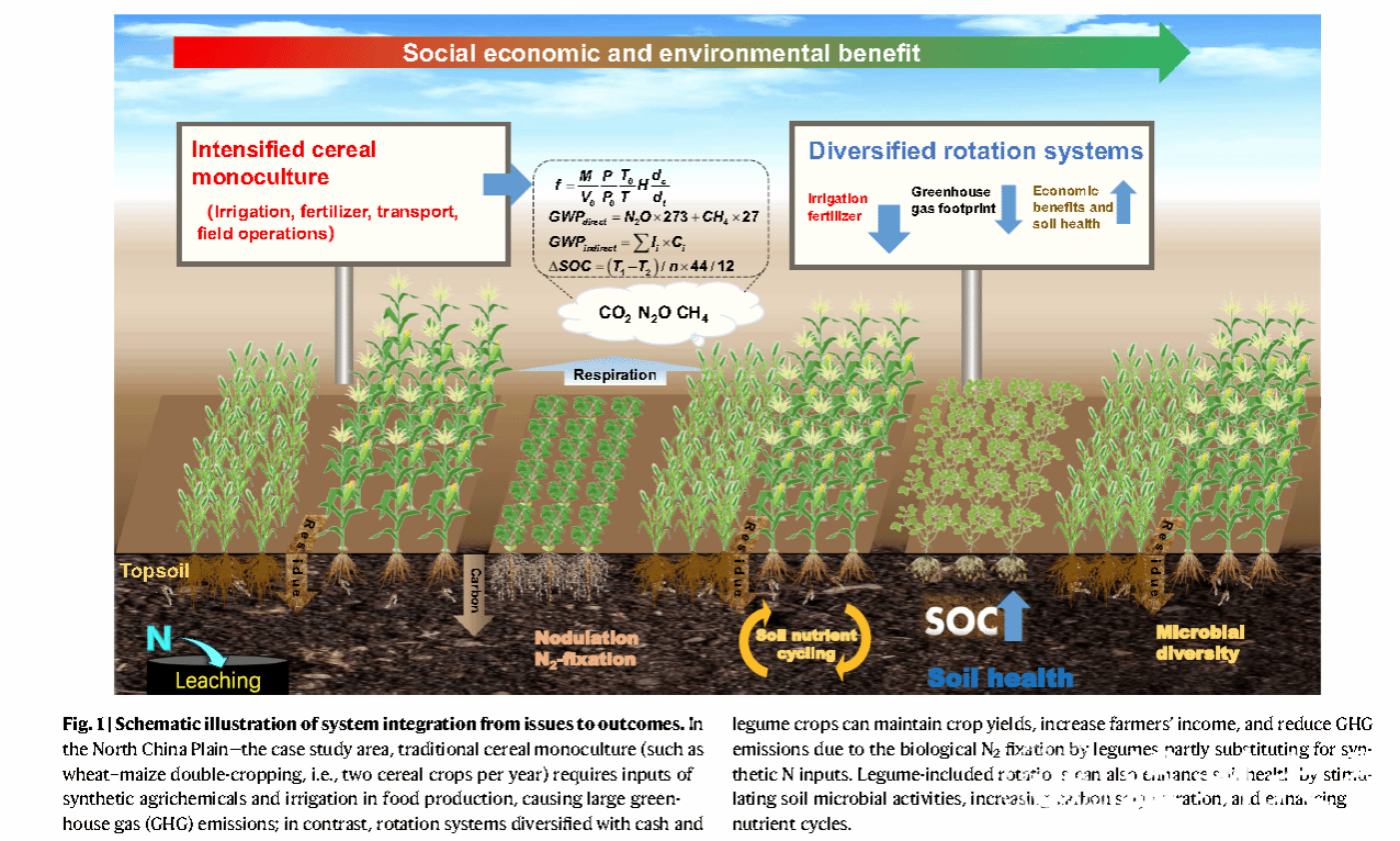 近日,ac米兰官网中文网站甘延太院士团队和中国农业大学、海南大学、中国科学院南京土壤研究所、中国科学院遗传与发育生物学研究所、康奈尔大学、西澳大学、丹麦奥胡斯大学和德国卡尔斯鲁厄理工学院共同合作在Nature Communications在线发表题为“Diversifying crop rotation increases food production, reduces net greenhouse gas emissions and improves soil health”的研究论文,ac米兰甘延太院士为论文共同通讯作者。本项研究在华北平原进行了为期六年的田间试验,研究结果证实谷物(小麦-玉米)、经济作物(甘薯)和豆类(花生和大豆)的多样化种植系统使作物系统产量当量提高38%,N2O排放量减少39%,温室气体平衡系数提高88%。此外,包括豆类作物在内的轮作可以刺激土壤微生物活性,使土壤有机碳储量增加8%,土壤健康评估指数提高45%。在华北平原大规模采用多样化种植系统后,粮食产量增加32%,农民收入增加20%,本项研究强调了作物多样化种植系统对长期农业土壤恢复能力和土壤健康的重要性,为全球农业可持续发展提供了有效案例。