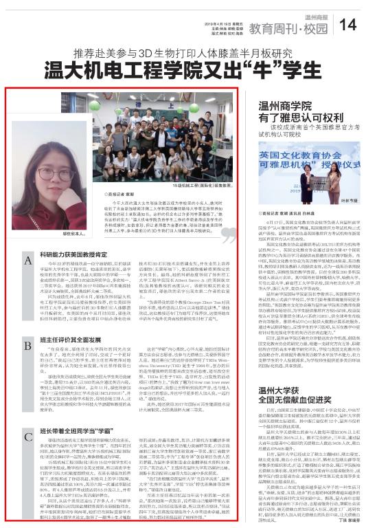 因为成绩优异,去年6 月,邬佳欣得到温大机电工程学院副院长冯爱新教授推荐,前往美国得州理工大学,参与最前沿的3D 生物打印人体膝盖半月板研究。在美国的两个来月时间里,邬佳欣担任科研助理,主要负责在项目中结合静电纺丝技术和3D 打印技术来搭建支架,并在支架上培养活细胞(无菌环境下),使活细胞能够按照指定的方向生长。最终,她的科研态度得到了得州理工大学工程学院院长Albert Sacco Jr. (前美国航空员)及其他教授的高度认可。该研究相关的论文被发表后,邬佳欣的名字出现在第二作者的位置上。