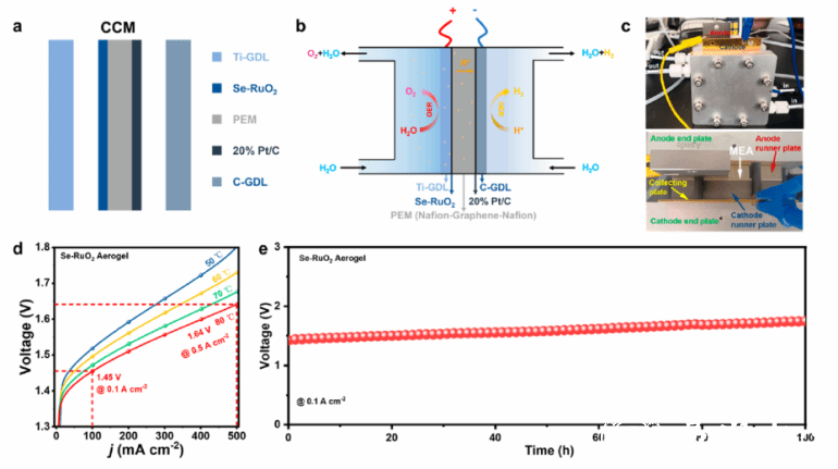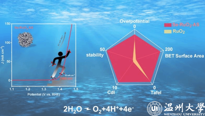 韩翔在王娟副教授的指导下,在论文中提出了一种创新的催化剂合成策略:利用过量硼氢化钠还原法成功制备了Se掺杂的RuO2气凝胶(Se-RuO2 Aerogel),并用作酸性条件下的高效OER电催化剂。以制备的Se-RuO2气凝胶为阳极催化剂的PEMWE装置可以在100 mA cm−2的电流密度下稳定运行100小时。此外,通过原位实验证明AEM机制是其在酸性OER反应过程中具有优异的稳定性的原因。本研究通过制造丰富的缺陷来暴露更多的活性位点,从而增强了OER活性和催化剂在酸性环境中的稳定性,为高效电解水催化剂的设计和制备提供了新的思路。