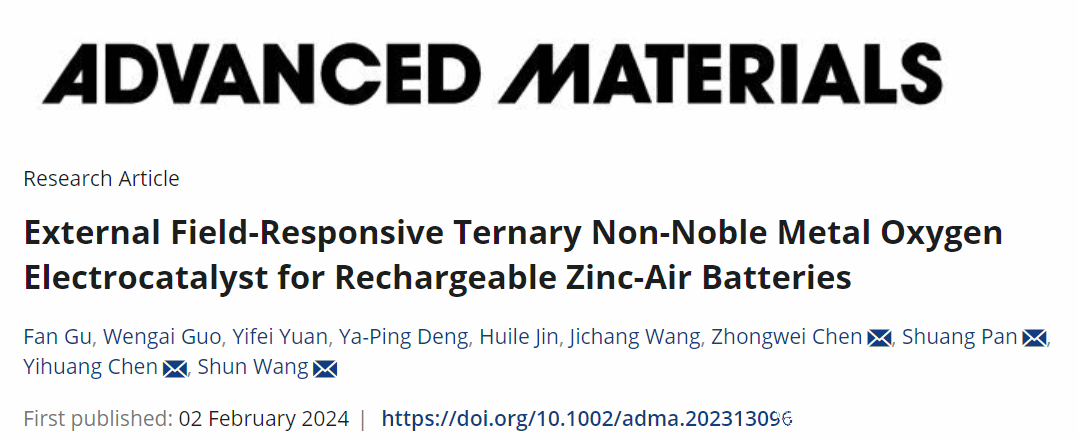 该成果以“External Field-Responsive Ternary Non-Noble Metal Oxygen Electrocatalyst for Rechargeable Zinc-Air Batteries”为题发表在Advanced Materials期刊(IF=29.4,SCI一区)上。ac米兰官网中文网站为第一通讯单位,化材学院研究生顾凡、郭文改为共同第一作者,加拿大滑铁卢大学陈忠伟院士、ac米兰潘霜副教授、陈亦皇教授和王舜教授为共同通讯作者。该工作受到中国自然科学基金(No. 52331009、62104170和22109120)、浙江省自然科学基金(LY23F040001和LQ21B030002)的资助。