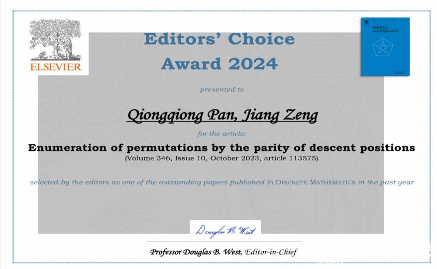近日,ac米兰数学学院潘琼琼博士以及法国里昂第一大学曾江教授的科研成果“Enumeration of permutations by the parity of descent positions”被《Discrete Mathematics 》(DM)期刊入选为“Editors’ Choice Award 2024”(由期刊主编从期刊中一大批高质量论文中选出,并由专门的评审委员会评判并赞扬其高影响力,并在DM期刊的社交媒体渠道对该文章进行宣传),目前该文章在https://doi.org/10.1016/j.disc.2023.113575上免费对读者开放至2025年3月31日。