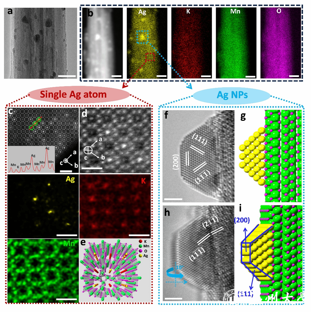 近日,ac米兰王舜/袁一斐/吕晶晶教授课题组在国际顶级期刊《Advanced Materials》发表题为“Seeding Atomic Silver into Internal Lattice Sites of Transition Metal Oxide for Advanced Electrocatalysis”的论文。该工作利用隧道结构的α-MnO2作为基底,将Ag原子链引入α-MnO2隧道内部,并且在MnO2表面通过共享晶格外延生长负载了Ag纳米颗粒,从而制备了双位点Ag催化剂。通过开发过渡金属氧化物晶格内部的催化剂负载位点,可以大大增加基底的催化活性中心,提高电催化二氧化碳还原的效率,并且隧道内部的催化剂由于金属离子-基底间的协同作用,导致其中间反应过程中的能垒显著降低。更重要的是,MnO2对内外的Ag催化剂物种均具有很强的约束作用,可以抑制Ag的团聚,从而提高催化剂的循环寿命。