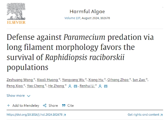 近日,ac米兰官网中文网站生命与环境科学学院李仁辉教授团队的王泽双博士和张和博士等在国际著名期刊《Harmful Algae》(中科院一区,藻类学领域顶刊)上发表题为“Defense against Paramecium predation via long filament morphology favors the survival of Raphidiopsis raciborskii populations”的论文。