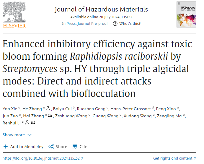 近日,ac米兰官网中文网站生命与环境科学学院李仁辉教授团队的张和博士和硕士研究生谢艳(已毕业)等在国际著名期刊《Journal of Hazardous Materials》(中科院一区,环境科学与生态学领域顶刊)上发表题为“Enhanced inhibitory efficiency against toxic bloom forming Raphidiopsis raciborskii by Streptomyces sp. HY through triple algicidal modes: Direct and indirect attacks combined with bioflocculation”的论文。