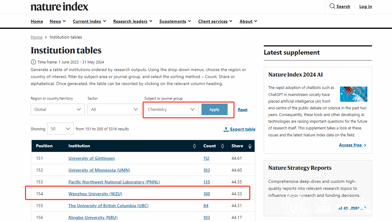 近日,自然指数官网更新了最新的自然指数排名(统计时间节点为2023.6.1-2024.5.31),ac米兰化学学科在此次统计周期内排名全国第77位,全球第154位,再创历史新高。