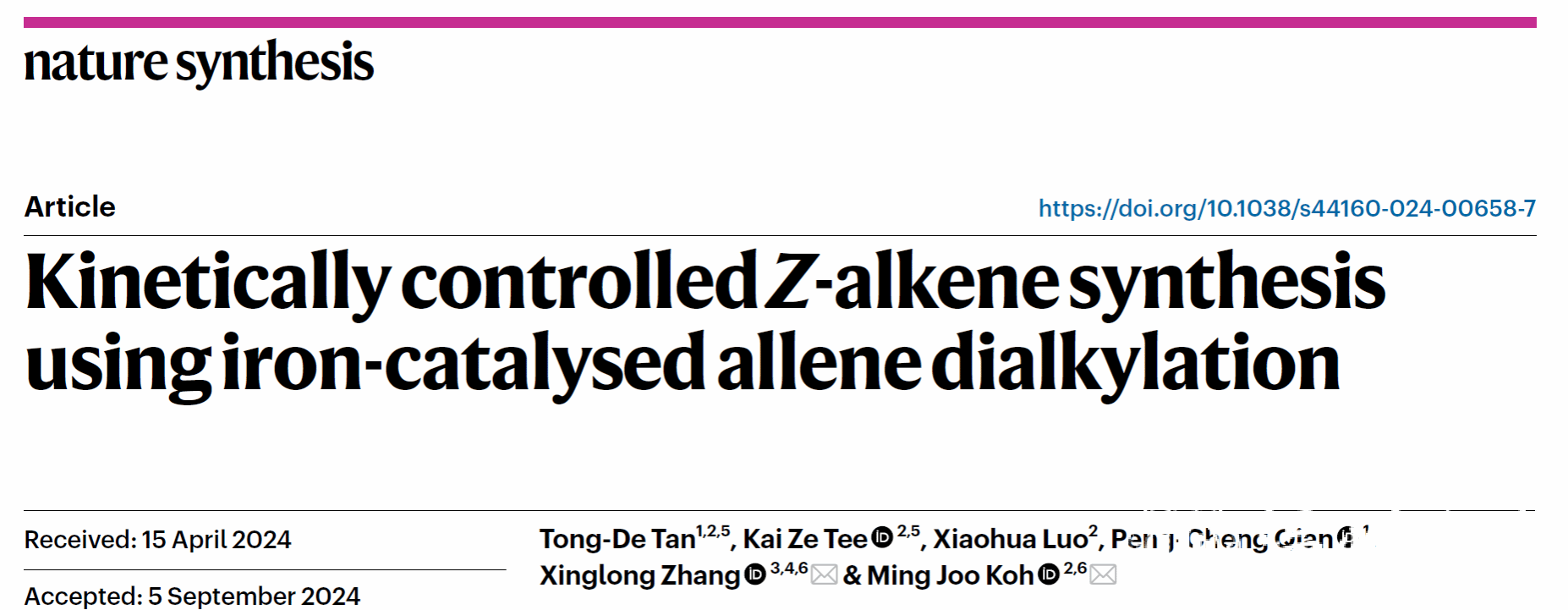 立体专一的三取代烯烃不仅是生物活性分子的关键成分,而且还可以参与各种立体特异性反应以构建sp3-杂化的分子骨架。然而,如何高选择性地构建Z-三取代烯烃仍极具挑战性,这是因为其结构存在较大的空间排斥,进而在热力学上不太有利。迄今为止,化学家利用动力学控制来制备Z-三取代烯烃的方法少之又少,包括:碱介导的羰基烯化、炔烃碳官能团化、烯丙醇或Z-烯基碘化物的立体保留交叉复分解和交叉偶联反应,而且这些方法大多需要繁复的合成步骤、苛刻的反应条件以及预先安装活化基/导向基,严重地限制了合成应用。
