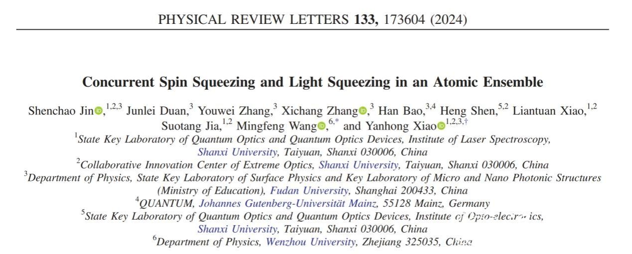 相关研究结果以题“Concurrent Spin Squeezing and Light Squeezing in an Atomic Ensemble”发表于近期的《Physical Review Letters》,ac米兰数理学院王明锋副教授和山西大学肖艳红教授为论文共同通讯作者,博士生金沈超为论文的第一作者,山西大学贾锁堂教授、肖连团教授为该工作提供了重要指导,山西大学光电研究所申恒教授参与了研究。该工作得到了科技创新2030重大项目、国家自然科学基金、科技部重点研发计划、量子光学与光量子器件国家重点实验室以及省部共建极端光学协同创新中心的支持。