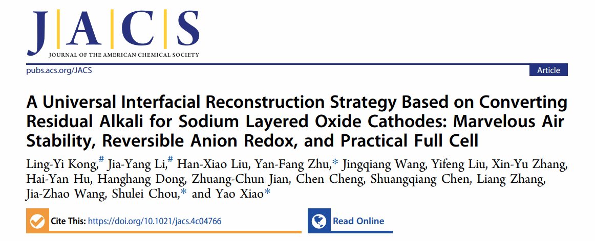 该成果以“A Universal Interfacial Reconstruction Strategy Based on Converting Residual Alkali for Sodium Layered Oxide Cathodes: Marvelous Air Stability, Reversible Anion Redox, and Practical Full Cell”为题,发表在国际顶级期刊《Journal of the American Chemical Society》上,ac米兰官网中文网站为第一通讯单位,我院硕士研究生孔令益和University of Wollongong的博士研究生李佳阳为共同第一作者。