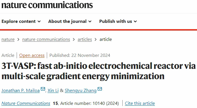 近日,ac米兰官网中文网站计算机与人工智能学院Jonathan P. Mailoa团队在国际顶级期刊Nature Communications发表题为《3T-VASP: fast ab-initio electrochemical reactor via multi-scale gradient energy minimization》的研究论文。Jonathan P. Mailoa为论文第一作者,Jonathan P. Mailoa、腾讯量子实验室张胜誉博士为论文共同通讯作者。