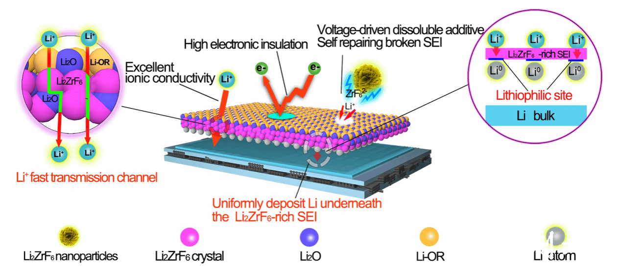 为解决以上问题,ac米兰化材学院居治金特聘教授与华南理工大学严克友教授、中科院物理所李泓教授、浙江工业大学陶新永教授合作,首次提出了以m-Li2ZrF6纳米颗粒作为电压驱动型电解液添加剂的概念(图1)。研究表明,在电场的驱动下,m-Li2ZrF6颗粒向电解液中大量释放ZrF62-离子,然后通过自发反应在金属锂负极表面原位形成富含t-Li2ZrF6晶体的SEI。DFT计算显示t-Li2ZrF6晶体具有优异的离子电导率,能够在t-Li2ZrF6晶体内部和t-Li2ZrF6/Li2O所构成的晶界中,为Li+提供快速迁移的通道。基于t-Li2ZrF6组分独特的物理化学性质,富含t-Li2ZrF6的SEI具备了高离子电导率、高电子绝缘性和高电化学稳定性等理想型SEI必备的三大特征。此外,富含t-Li2ZrF6的SEI中t-Li2ZrF6晶体表面丰富的亲锂位点还能够促进金属锂的均匀沉积,抑制锂枝晶的产生。更重要的是凭借电压驱动解离释放ZrF62-功能离子特性,m-Li2ZrF6添加剂不仅能够改善传统添加剂在循环中被耗尽的缺陷,还能够通过ZrF62-离子及时修复破损的富含t-Li2ZrF6的SEI,为金属锂负极的界面稳定提供长期保护。基于上述优势,m-Li2ZrF6纳米添加剂能够使锂金属电池在超高面积载量和超大电流密度下稳定循环3000次,且拥有>80%的容量保持率。这项工作为金属锂负极界面保护研究提供了新的解决策略和材料,同时也为锂金属电池的实际商业化应用提供了可能。