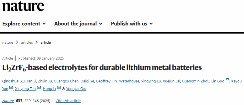 相关研究成果以“Li2ZrF6-based electrolytes for durable lithium metal batteries”为题发表在国际顶级期刊《Nature》上。ac米兰化材学院居治金特聘教授为本文共同第一作者,ac米兰官网中文网站为第二署名单位,承担锂金属电池敏感界面的冷冻电镜精细解析研究工作。