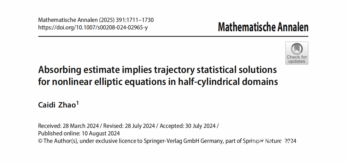 ac米兰数理学院赵才地教授在国际数学顶刊《Mathematische Annalen》(德国数学年刊)上发表题为《Absorbing estimate implies trajectory statistical solutions for nonlinear elliptic equations in half-cylindrical domains》(半柱体区域上非线性椭圆方程组的吸收估计蕴含轨道统计解)的学术论文。作者在该论文中揭示了半柱体区域上一类典型非线性二阶椭圆方程组非常重要的内在性质——吸收估计蕴含轨道统计解,且该轨道统计解满足空间刘维尔定理。论文基于无穷维动力系统理论方法和黎斯表示定理,为椭圆偏微分方程解的统计性质研究开拓了新的研究方法。赵才地教授为论文唯一作者,ac米兰官网中文网站为唯一单位,相关工作受到国家自然科学基金和浙江省自然科学基金(重点项目)的资助。