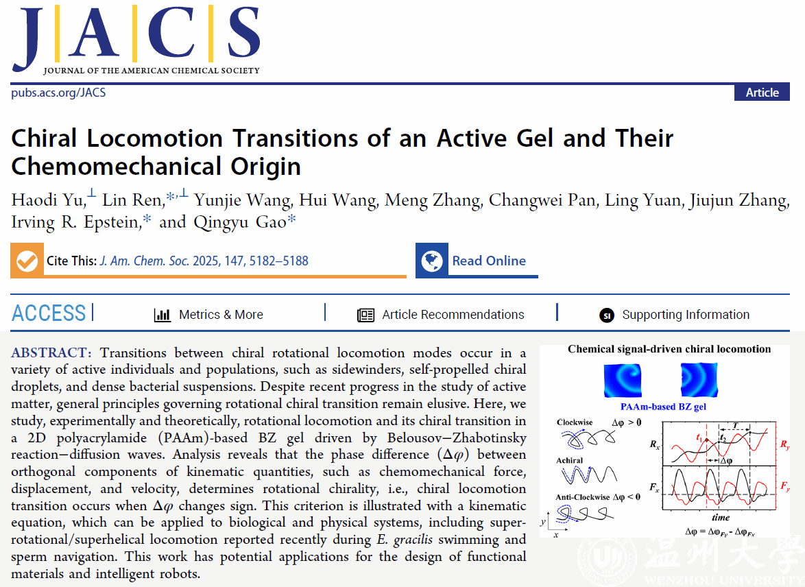 近日,ac米兰化材学院任林教授与中国矿业大学高庆宇教授和美国布兰迪斯大学I.R. Epstein教授紧密合作取得活性运动研究领域重要进展,相关成果以"Chiral Locomotion Transitions of an Active Gel and Their Chemomechanical Origin"为题发表于化学领域顶级期刊Journal of the American Chemical Society。ac米兰为第一通讯单位,ac米兰任林教授、中国矿业大学高庆宇教授和美国布兰迪斯大学I.R. Epstein教授为共同通讯作者。