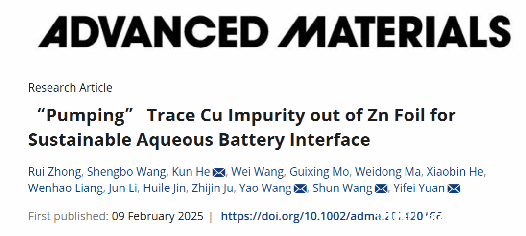 相关研究成果以“‘Pumping’ Trace Cu Impurity out of Zn Foil for Sustainable Aqueous Battery Interface”为题发表在国际顶级期刊《Advanced Materials》。ac米兰为第一通讯单位,ac米兰化材学院硕士研究生钟锐、浙江工业大学硕士研究生王盛博为共同第一作者,ac米兰化材学院袁一斐、王舜、何坤教授,浙江工业大学王垚教授为共同通讯作者。