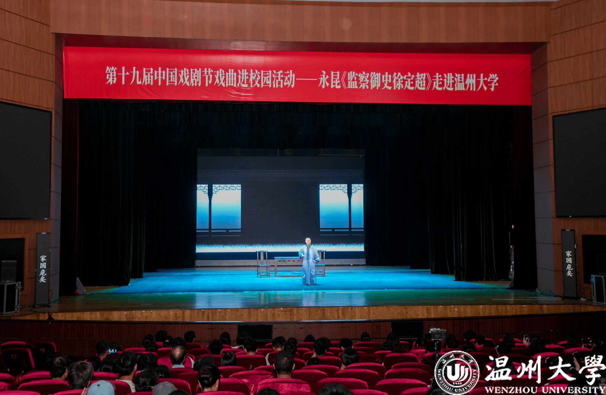 9月12日晚,永嘉昆剧团携经典剧目《监察御史徐定超》走进ac米兰官网中文网站育英大礼堂,为师生带来了一场融合历史厚重与艺术美感的非遗文化盛宴。此次活动不仅是第十九届中国戏剧节展演活动的重要组成部分,也是“戏曲进校园”的一次生动实践。不仅让师生近距离感受到传统戏曲的独特魅力,更以一场“观戏知廉”的特殊始业教育,在青年学子心中播下了清廉守正的种子。