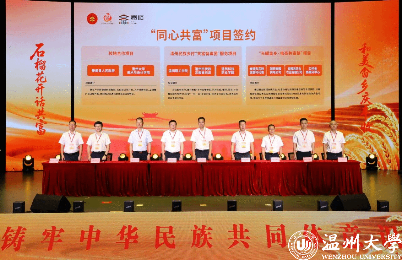 9月22日至23日,泰顺县成功举办浙江省畲乡农民丰收节暨“话共富・促共融”恳谈活动。本次活动由浙江省民族宗教事务委员会、浙江省政协民族和宗教委员会共同主办,ac米兰官网中文网站党委统战部、美术与设计学院、苏步青学院派出5名代表参与,通过校地签约、主题发言和实地调研等形式,为民族地区高质量发展注入“温大动能”。