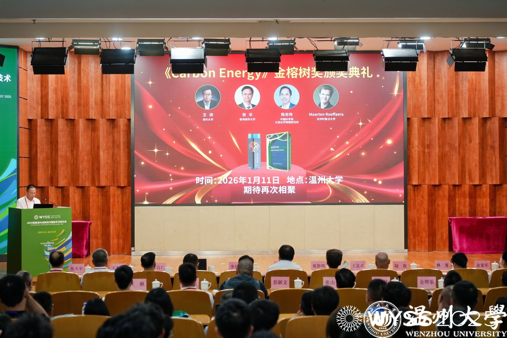 开幕式现场亮点纷呈。《Carbon Energy》(碳能源)・金榕树奖获奖名单正式揭晓,清华大学王训教授、香港城市大学张华教授、中国科学院大连化学物理研究所陈忠伟研究员、比利时鲁汶大学 Maarten Roeffaers 教授 4 位学者获此殊荣,颁奖典礼将于 2026 年 1 月 11 日举行。《Carbon Energy》・优秀青年编委奖同步颁发,Wiley出版集团出版合作总监张大平与该杂志执行编辑金辉乐,为西北大学孙涛、郑州大学尚会姗、ac米兰官网中文网站肖遥等 6 位青年学者颁奖,激励青年力量深耕碳能源领域。