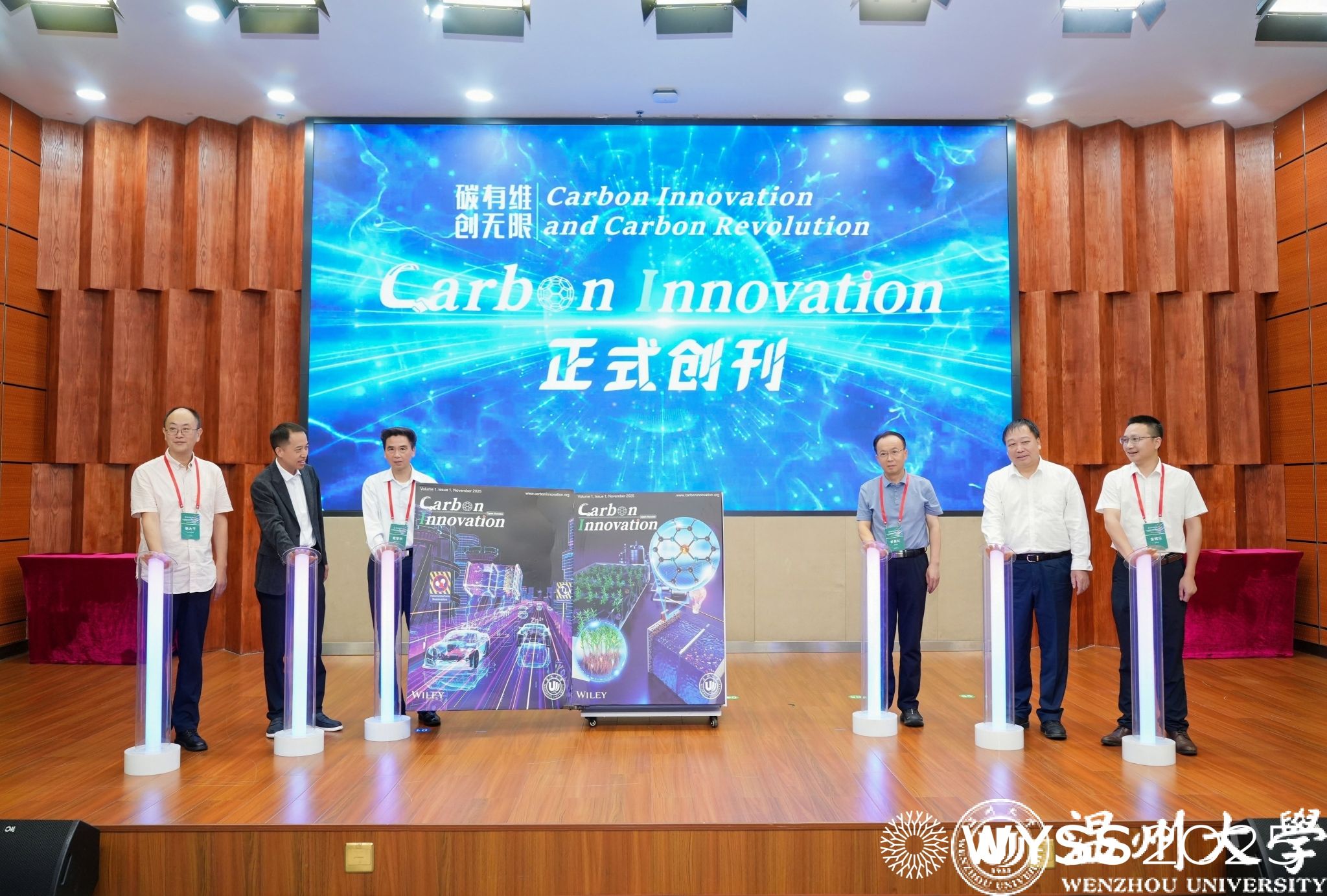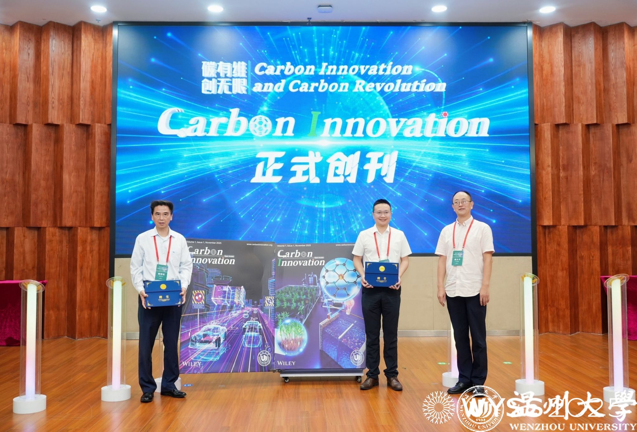 《Carbon Innovation》新刊启动仪式同步举行,戴黎明院士、李景虹院士、陈忠伟院士、赵敏校长、张大平总监、金辉乐副院长共同见证这一时刻,张大平总监还为戴黎明院士、金辉乐副院长颁发《Carbon Innovation》主编证书,标志着ac米兰官网中文网站在碳能源领域国际学术传播平台建设再添新翼。