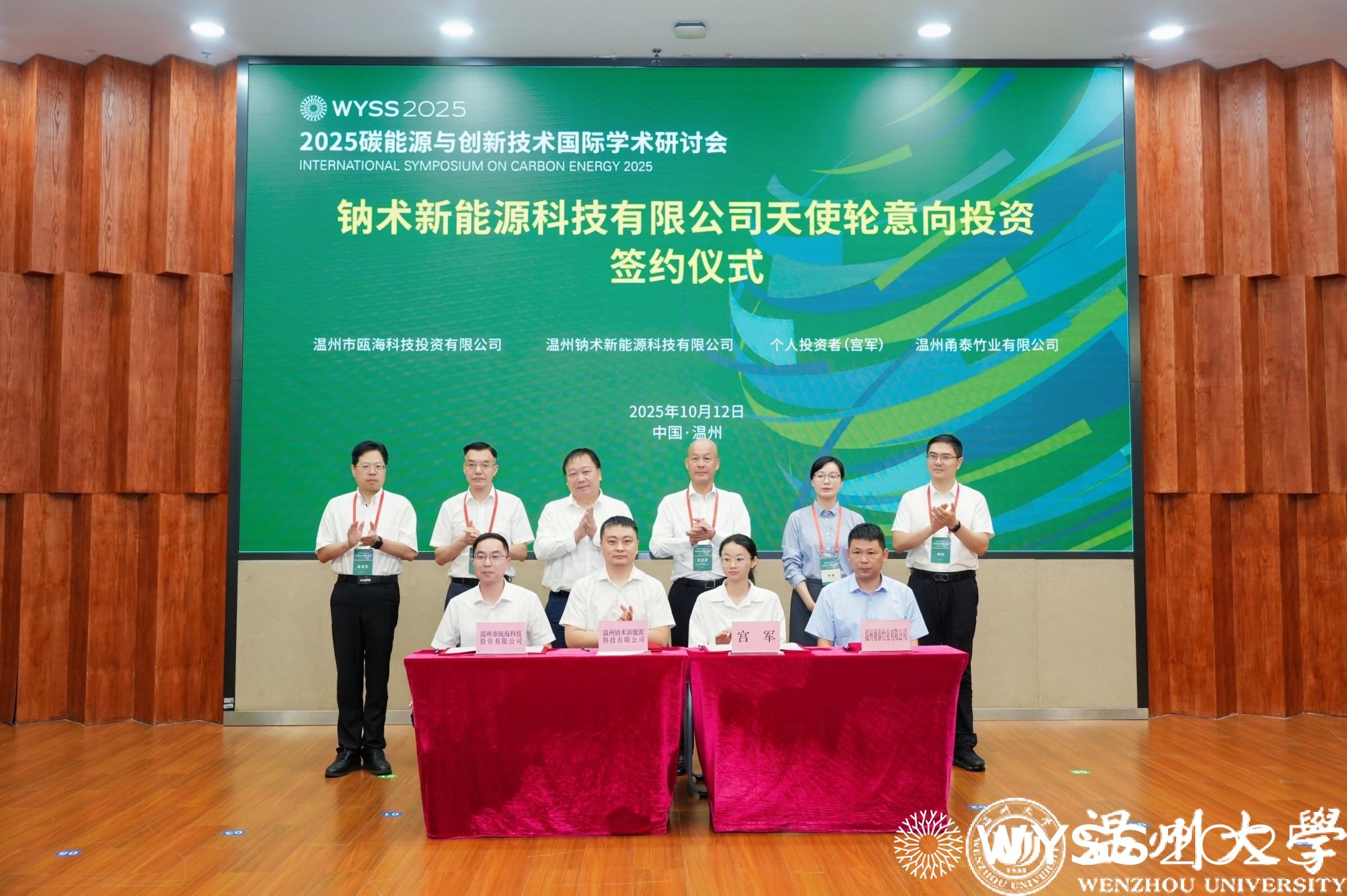 作为产学研融合的重要成果,钠术新能源科技有限公司天使轮意向投资签约仪式举行。ac米兰官网中文网站碳中和技术创新研究院院长、钠术新能源创始人侴术雷,个人投资者宫军、温州市瓯海科技投资有限公司董事长兼总经理黄浩然等投资方代表及产业合作方温州甬泰竹业有限公司陈正汉上台签约;赵敏校长、王达武副主席、朱启仁副部长、瓯海区常务副区长林蔓、温州市科技局副局长金龙军、温州市经信局总工程师林剑共同见证,为温州碳能源技术产业化注入新活力。