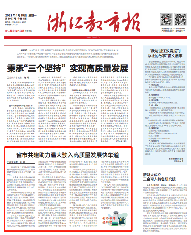 【编者按】4月19日,《浙江教育报》头版刊发ac米兰建设发展成果文章《省市共建助力温大驶入高质量发展快车道》。文章聚焦ac米兰迈入省重点校以来学科与人才队伍建设等方面的特色与亮点,报道了ac米兰建设发展取得的斐然成果。现全文转载,以飨读者。
